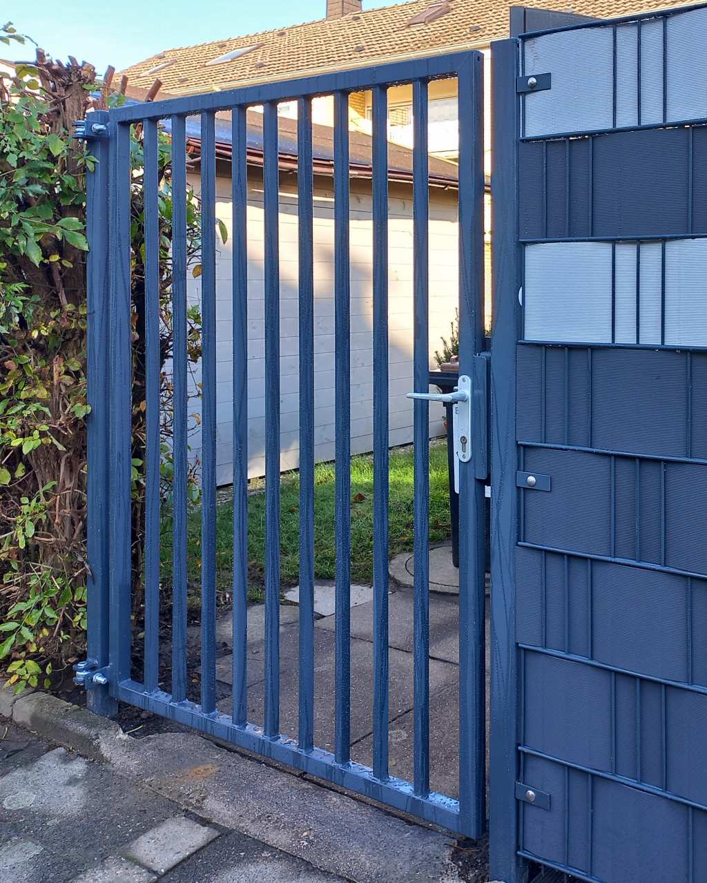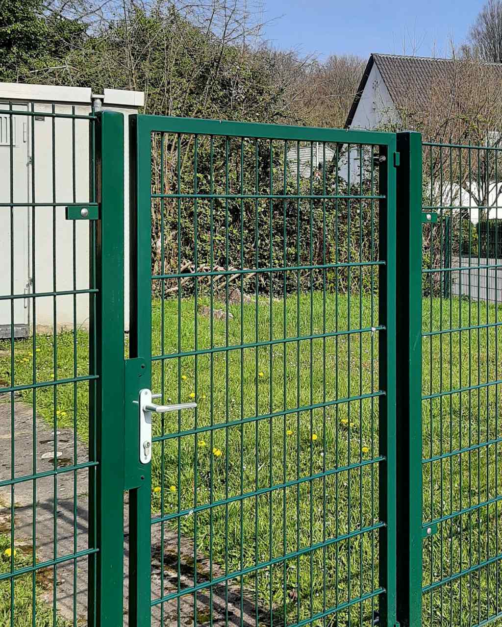 EBERT-Türen bieten die perfekte Ergänzung für Gitter- und Maschendrahtzäune – nach Kundenwunsch als Maßarbeit in unserer Schlosserei gefertigt. Ausführungen in der Standardbreite von 1.000 mm sind in verschiedenen Höhen ab Lager verfügbar. Von der leichten einflügeligen Gartentür bis hin zu großen Anlagen sind sämtliche Varianten möglich. Die Oberfläche der Türen wird durch eine Feuerverzinkung versiegelt. Neben einer Pulverbeschichtung in den Standardfarben moosgrün (RAL 6005) oder anthrazitgrau (RAL 7016) bieten wir Beschichtungen in sämtlichen weiteren Farben der RAL-Skala sowie in Effekt- und Sonderfarben. Neben einer seidenglänzenden Oberfläche stehen auch matte und strukturierte Oberflächen zur Auswahl.